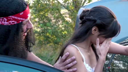 На дороге у девушки пробило колесо. Запаска у нее есть, а вот инструментов чтобы заменить колесо нет никаких. Рядом стоял эвакуатор, чей водитель разглядывал молодую незнакомку с головы до ног. Он подошел расспросить что случилось, а когда у него попросили ключ, соврал, будто ничего такого нет с собой. Тогда бедняжка разревелась. Волосатый мужик ее попытался успокоить, приобнял сзади, положив ее руку себе на штаны. Случился секс, после которого дядя подарил баллонный ключ, но не стал менять колеса, а просто сел обратно в машину с фразой "asta la vista" и укатил в закат, расстроив давалку второй раз.