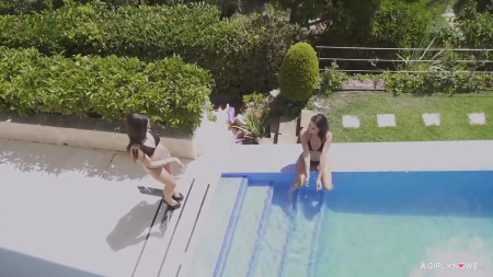 Две молоденькие сожительницы одинаковой фигуры вышли с утра немного погреться под солнцем. Они лесбиянки, потому не стоит удивляться, что они держатся за ручки и много целуются совсем как пара. На заднем дворе у них есть классный бассейн с потрясающим видом на богатый район частных домов. Эдакая американская мечта исполнилась у подружек, решивших заняться любовью прямо на краю бассейна. Из интересного им достаточно собственных языков для кунилингуса и еще черного фаллоимитатора. Ну и как же не потереться кисками друг о дружку, попутно втыкая язычок в попочку?!