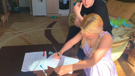 Смешливая девчонка в очках собралась поступать на художественный факультет, но даже с обычными кубами у нее большие проблемы, причем сама героиня не видит проблем, но видит друг, который принес стирательную резинку и показал огрехи. Также интересна его философская мысль: поступает не тот, кто подготовился, а тот, кто уверен в себе. Приятель считает, что именно уверенности не хватает подружке, которой стало еще более страшно от его прикосновений к плечам и поцелуя. Далее все как по накатанной: взаимный обмен оральными ласками и секс до окончания спермой на язычок, а оттуда на девичью грудь.