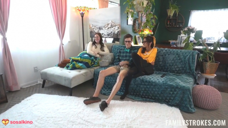 Братик-ботан вечно достается свою сводную азиатскую сестру тем, что он лучший в семье и ей требуется конкретная аргументация, чтобы это опровергнуть. Сейчас на дворе недрочабрь и парень держался до последнего, пока хитрая сестренка не начала его дразнить дрочкой и минетом при матери, вошедшей в комнату и не заметившей голый член в ротике дочки за экраном ноутбука. Женщина пригласила отпрысков посмотреть вместе фильм и они действительно отправились в гостиную для этого, но малышка в очках не упустила шанс снова возбудить брата, чтобы он кончил, правда, для этого понадобилось сделать так, чтобы он трахнул ее сочную дырочку через прорезанные колготки при уснувшей матери, да и так и не выяснилось кто первый кончил, так что оба очкарика проиграли.
