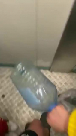Парень со своей подругой заняли лифт в дневное время, когда все должны быть на работе для того, чтобы там как-то разнообразить совместную половую жизнь. Еще не дождавшись открытия дверей лифта, гопник уже достал свой член, а ведь внутри кто-то мог быть, но яйца уже бурлят и, когда парочка извращенцев заходит внутрь кабины, любовница тут же присаживается на корточки и начинает сосать его член, пока лифт не вызвала соседка с бутылками для воды, с которой все трое поехали до первого этажа, чтобы вновь нажать на верхний и потрахаться рачком лицом в зеркалу без зеленой футболки, а в конце надрочить пышную влажную пизду рукой.
